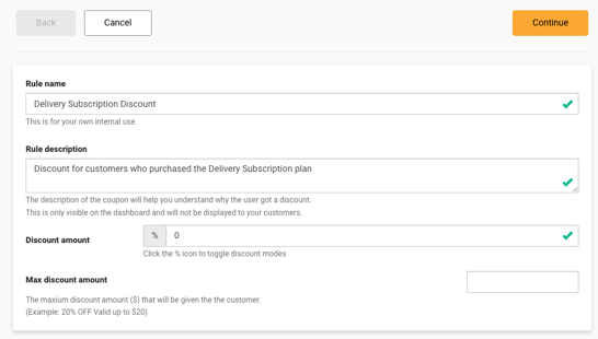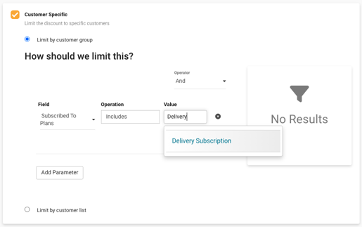 - Change Field to 'Subscribed to Plans' and type in your subscription plan name in for the Value, then click on the right plan when it appears. This will ensure that your delivery discount is applied only to customers who have subscribed to your delivery subscription service. When the page is complete, it should look like this: